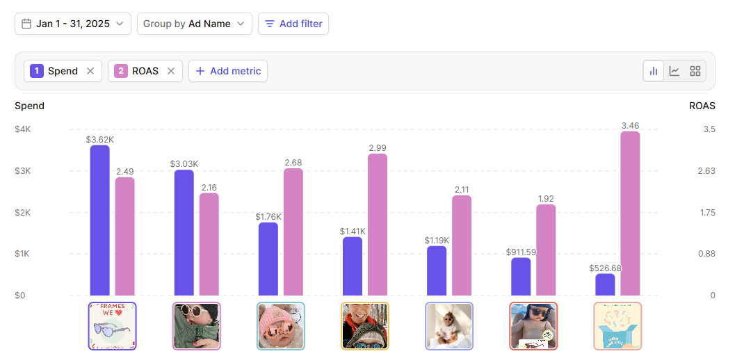 We focus on ROAS and total spend to identify creative winners. Determining the key creative concepts that directly drive revenue and scale are key. From there, we break down engagement metrics, CTR, thumbstop ratio, hook rate and watch time to generate insights for high-performing iterations and drive new creative production.